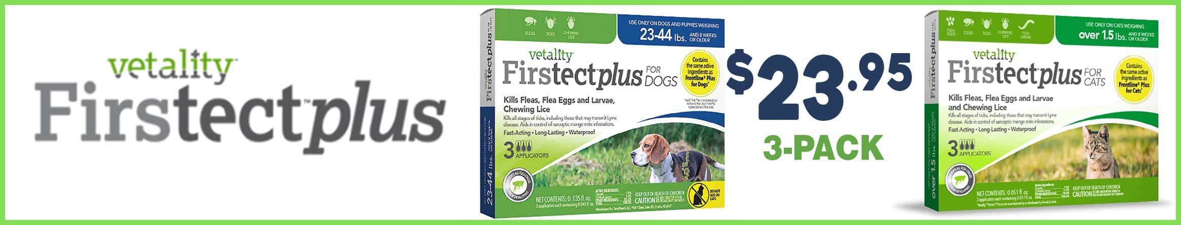 The generic equivalent to Frontline Plus for dogs, puppies, cats and kittens 8 weeks and older, Firstect Plus contains Fipronil and (s)-methoprene. Kills fleas and flea eggs up for to three months and ticks for one month with a single treatment. A monthly topical that is safe and effective.