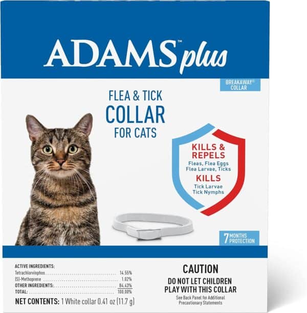 The Adams Plus Flea & Tick Collar for Cats provides immediate relief from biting fleas, ticks, flea larvae, flea eggs, tick nymphs, and tick larvae through contact. This collar prevents re-infestations by breaking the flea lifecycle, killing the flea eggs and flea larvae, and providing continuous prevention against new fleas and ticks for up to 7 months. The active ingredients that cover the surface of the collar are rubbed onto the animal’s fur, and the solution works its way down through your cat’s natural hair oils and across the body to protect head-to-toe. This collar is fully adjustable and offers a unique break-away feature designed to ensure peace of mind.