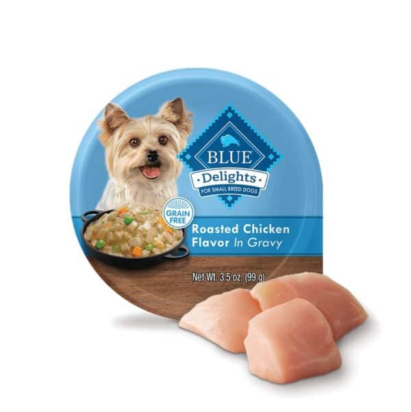 BLUE Delights are scrumptious and nutritious single-serving entrées ideal for small dogs with big appetites. Our Rotisserie Chicken recipe features high-quality chicken in hearty gravy, plus carrots, potatoes and peas enhanced with vitamins and minerals. A grain-free savory treat for your adult dog.