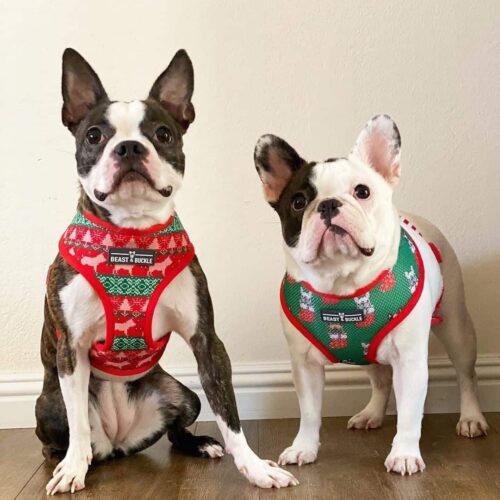 With this reversible dog harness, two is definitely better than one! This stylish holiday print harness features a red and green quilted pattern on the front and an adorable Christmas dog pattern on the back. Made with quality, washable material and easy to snap clips. A robust metal leash anchor completes the great functionality and durability of this harness.