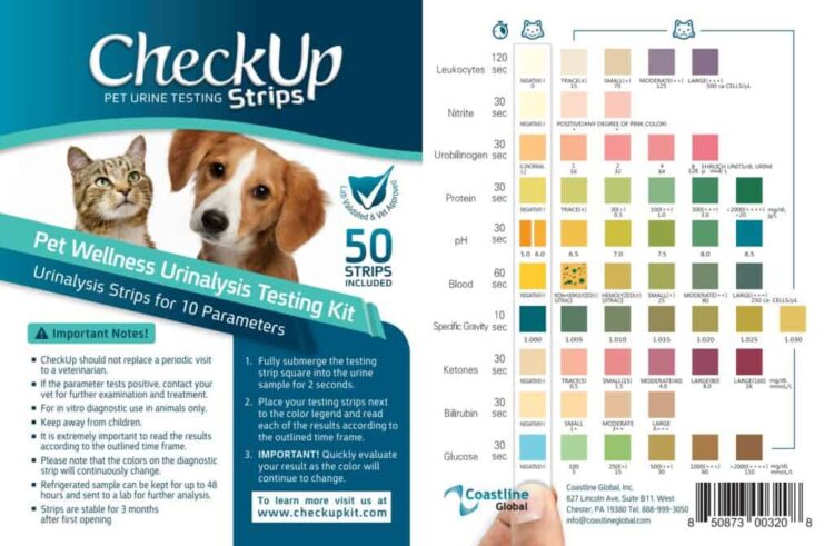 The ChreckUp At-ome Pet Urine Testing Strips include 50 individual CE-grade diagnostic Urine testing strips to check for a variety of different parameters and their level of presence in the urine. These parameters correspond with different medical conditions common in house pets. Checkup Strips help you monitor these conditions at home yourself, and keep a close eye on your beloved pets health.
