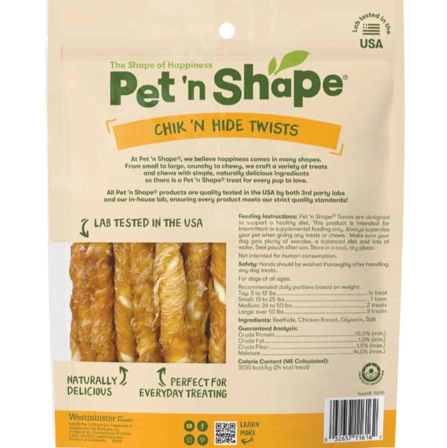 - Pet ‘n Shape All-Natural Chik ‘n Hide Twists are a yummy combination of all-natural chicken breast fillets wrapped around savory rawhide sticks. Each treat provides your dog with a high-protein, low-fat, and completely natural snack, with no artificial additives, preservatives, and colors and free of wheat, corn, and soy. All ingredients have been lab tested for safety and carefully roasted to ensure optimal quality and flavor. Plus, they come in a resealable bag for convenience and freshness.