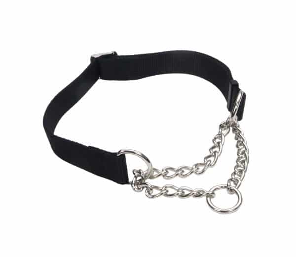 A humane form of control that offers the advantage of both nylon and chain. The limited closure chain on this martingale collar gives a crisp chain sound upon correction. This martingale training collar is adjustable for a perfect fit and maximum comfort and control. Adjust to fit like a collar with the chain fully extended. The rust proof chain and hardware will not mat longhaired coats. Noise of chain sliding alerts the dog to slow down. A great training aid. Black only.