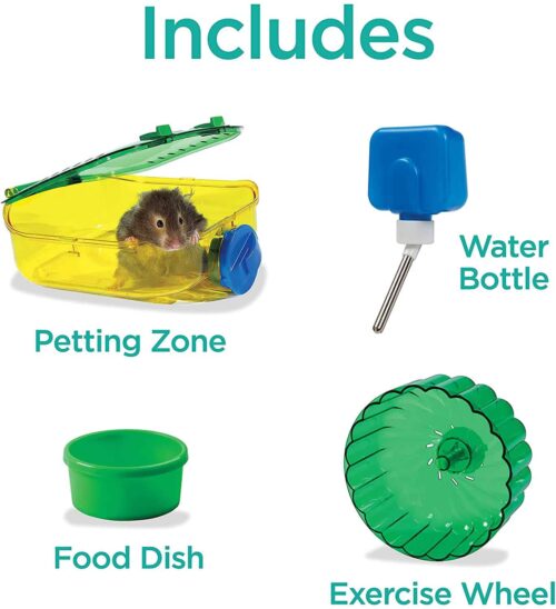 • Includes a petting zone, exercise wheel, food dish and water bottle