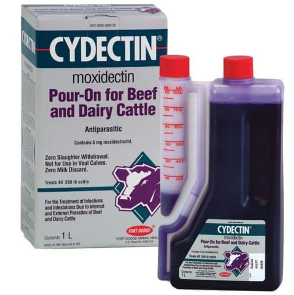 (Moxidectin) Ready to use topical formulation for control of roundworms, lungworms, grubs, lice and mites in cattle. Also provides 7 days of persistent activity against horn flies. No slaughter or milk withdrawal. Not for use veal calves. Apply 1 ml for each 22 lbs. of body weight along the top of back from the withers to tail head.Efficacy not affected by rainfall. For the treatment and control of gastrointestinal roundworms, lungworms, grubs, sucking and biting lice, mites and horn flies in beef and dairy cattle. Weatherproof formula allows for flexibility to treat without the worry of the dewormer washing away.