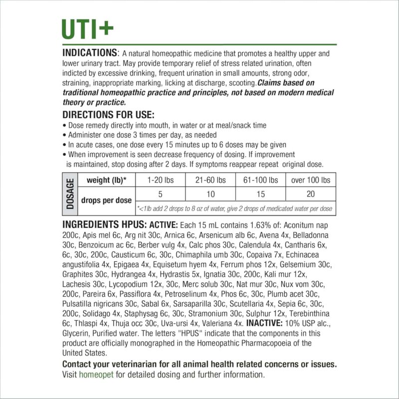 - FOR PETS OF ALL AGES: HomeoPet’s UTI + for cats and dogs is well tolerated, safe, gentle, and natural with no known side effects. Can be used on pets of all ages as a supportive pet UTI medicine when urinary issues occur.