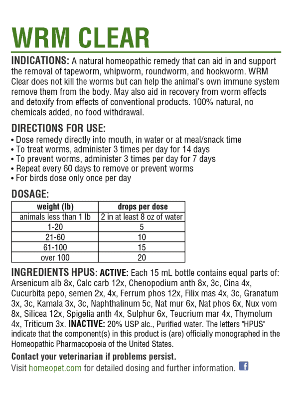- HomeoPet WRM CLEAR has been safely used on dogs and cats of all ages in addition to birds, rabbits, guinea pigs, and other animals for many years.