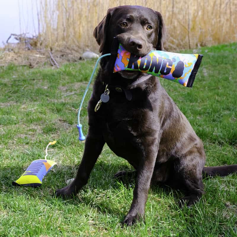 The KONG Bunji High-Viz Bumper is specially designed with bright colors and contrasting patterns. Makes for high visibility in various environments. Heavy duty firehose material, sealed edges, and bungee rope makes this toy perfect for energetic fetch play. The squeaker engages natural instincts during play sessions, while the ergonomic rope & handle design effortlessly launches at long distances, saving your shoulder from burnout!