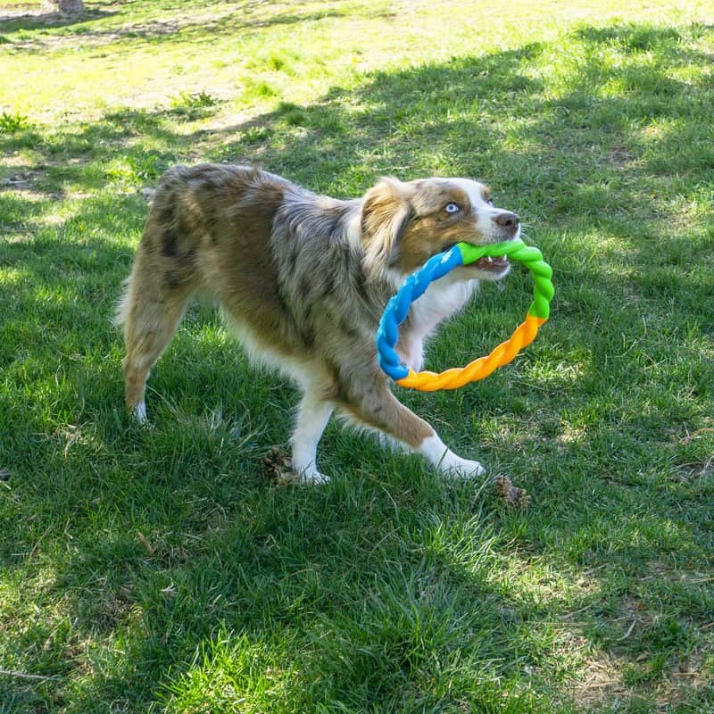 KONG Twistz High-Viz Ring’s vibrant, highly visible colors make this the perfect toy for all outdoor environments, weather, and terrain. This twisted ring is easy-to-grip, with bright colors that stand out in tall grass, at the pool, in snow, on dreary days—even at night with glow-in-the-dark technology. Durable material gives the Twistz High-Viz Ring a dynamic bounce and long-distance rolling action. Charge the Ring under a lamp or in the sunlight for glowing fun.