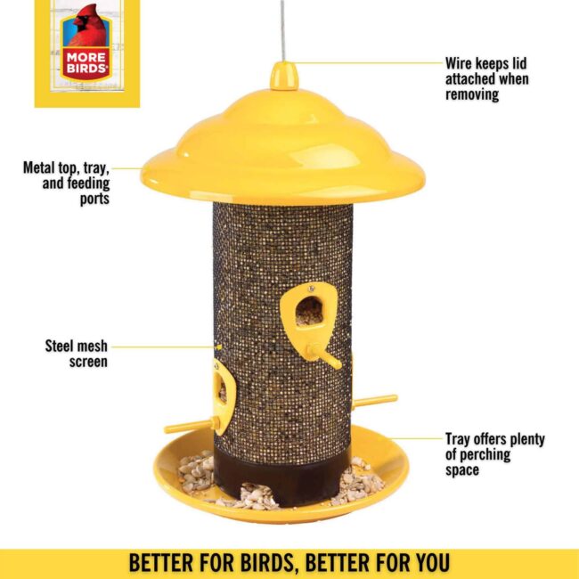 This all-metal feeder has a wavy roof to keep your seed dry. Features mesh with four feeding ports and perches to attract clinging and perching birds. The black mesh hopper provides a nice contrast for viewing your winged visitors, while seed filters into the feeding tray to feed more birds. Includes hanging loop with yellow powder coated finish. 8 inch diameter. 12-1/2 inches tall.