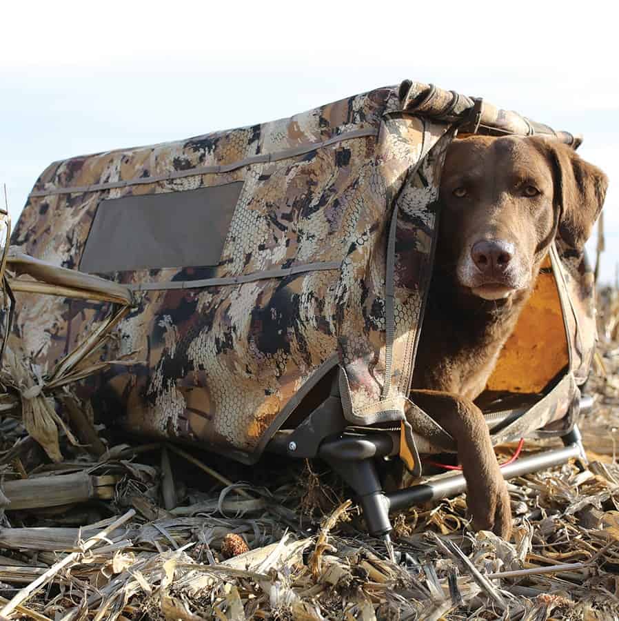 A low profile version of the original The Field House LP is hands down the most comfortable dog blind on the market. The mesh floor easily drains water, while providing your pup with a comfort level not seen before in a dog blind. When deployed the legs elevate the blind 3 inches off the ground giving the floor a cot style setup. This design keeps your dog off the ground and dry. The blind comes equipped with zippers on front and back doors and mesh windows on the side, allowing for use as a temporary crate as well.