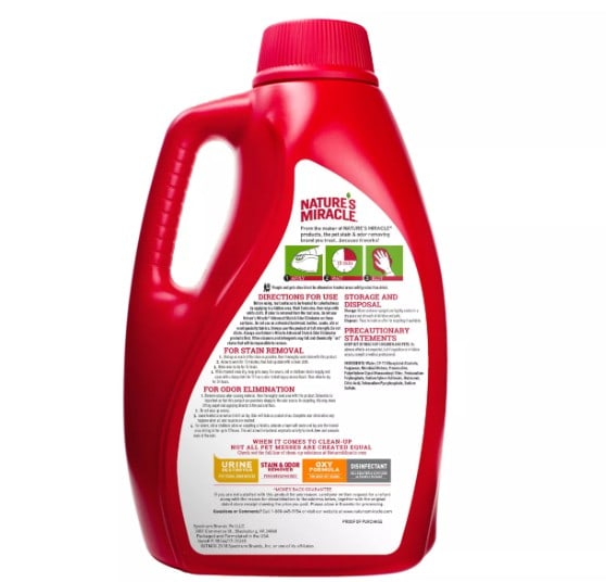 Nature’s Miracle Advanced Stain & Odor Eliminator has a severe mess enzymatic formula that produces enzymes when it comes in contact with a food source, such as pet urine, feces, vomit and other bio-based messes. The enzymatic cleaner will continue working as long as the food source is present. This formula also includes patented microbes that target your toughest pet odors. When used and stored as directed, this product is safe for use on carpets, hard floors, furniture, fabrics and more, and also freshens with a light fresh scent. This product is safe for your pets and home, when used and stored as directed.