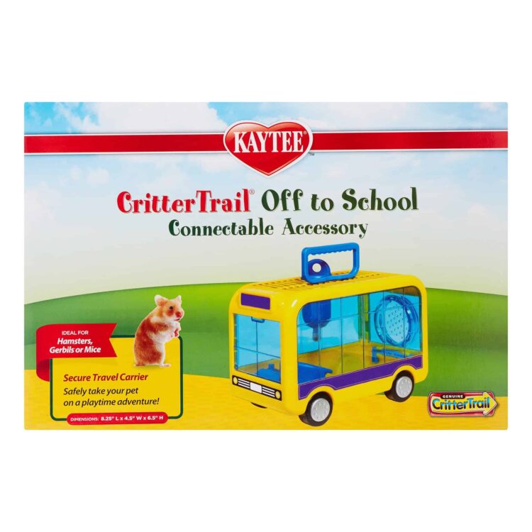 CritterTrail Off-To-School Small Animal Home & Carrier is a fun and functional habitat accessory designed for hamsters, mice, gerbils, and other small pets. Shaped like a colorful school bus, this multi-purpose unit features real rolling wheels for playtime and can also be used as a temporary habitat or convenient travel carrier.