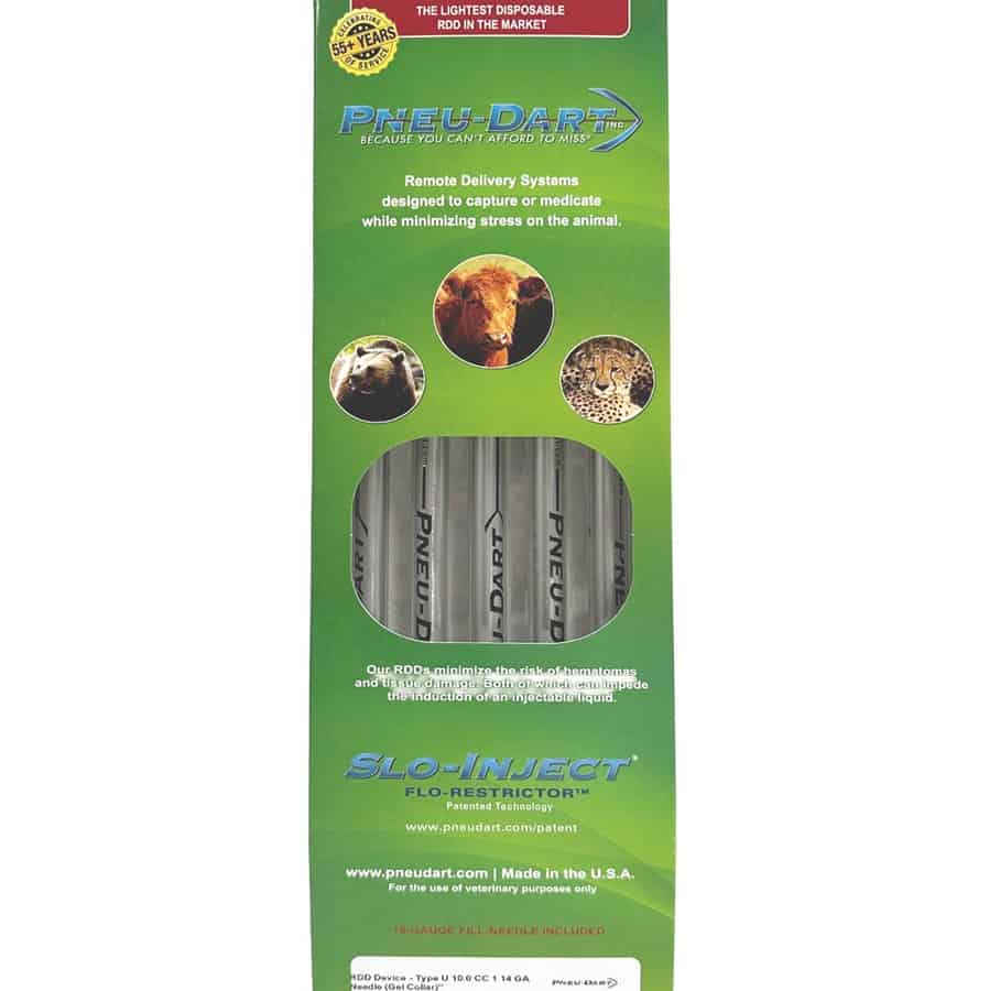 RDDs 1.5cc through 10cc are equipped with a gelatin collar, but can alternatively be ordered with a wire barb. Gelatin collars comprise of an inert material retaining the RDD in place until the injection is made, and after several minutes will liquefy, allowing the RDD to fall freely from the animal.