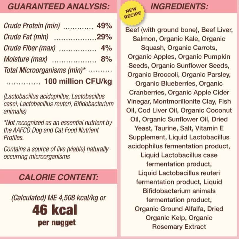 - Made with antibiotic, hormone and steroid-free beef organs and real salmon, along with fresh ground bone for calcium supplementation.