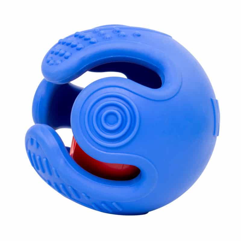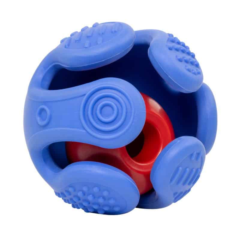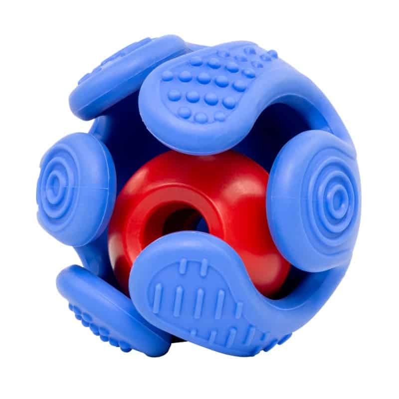 - Nested treat dispenser rolls unpredictably to disperse treats
