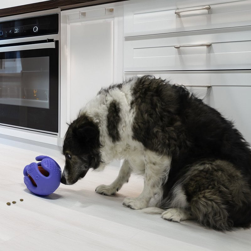 KONG Rewards Wrapz is an action-packed, nested treat dispenser that rolls unpredictably, dispensing treats as dogs nudge and prod with their noses and paws. This ball is ideal for daily enrichment, keeping dogs busy and engaged. Treats are held in a hard inner ball, wrapped in a durable, textured bumper ball on the outside, creating a rattling, thumping sound that excites dogs and sparks foraging instincts.