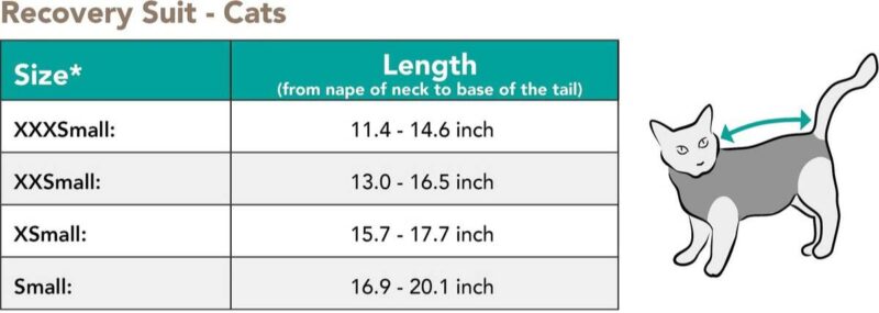 We’re here to help you find the best size Recovery Suit® for your cat! To find the right size, measure the distance from the neck (collar) to the base of the tail, as explained in the instruction video, and fill in the required measurements in the size calculator below.