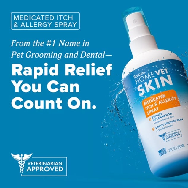 TropiClean HomeVet Medicated Itch & Allergy Pet Spray provides fast, on-contact relief for itchy, red, and irritated skin caused by seasonal allergies, hot spots, and minor skin irritations. This gentle, sting-free formula is powered by 0.25% hydrocortisone to reduce inflammation and colloidal oatmeal to hydrate and soothe sensitive skin. Safe for dogs and cats, it’s vet-recommended and perfect for use on paws, hot spots, and allergy-prone areas. Simply spray—no messy application needed—and let the vet-strength formula go to work.