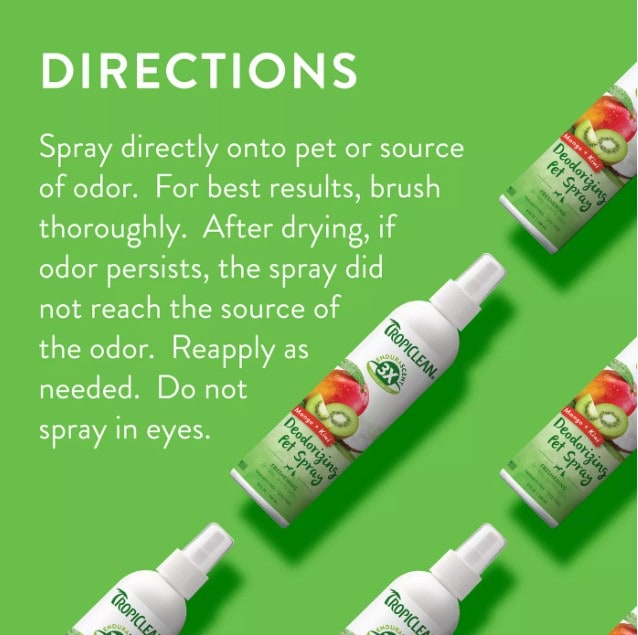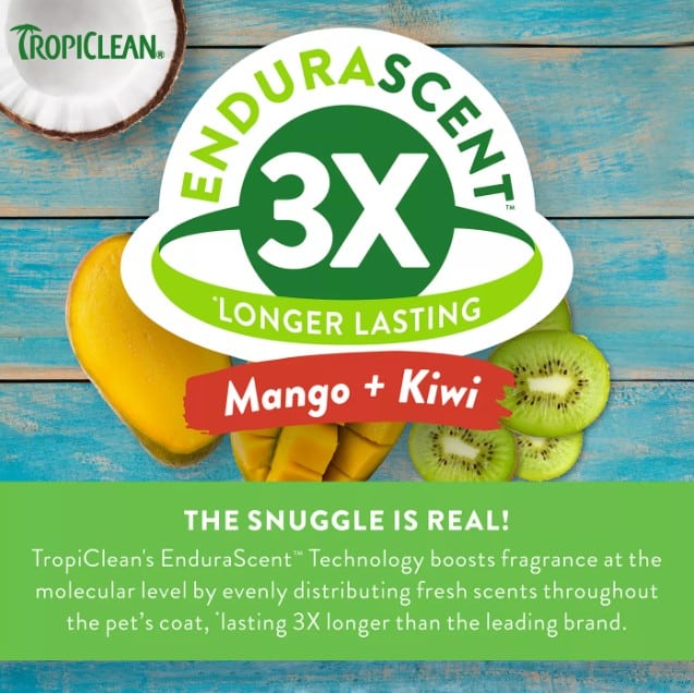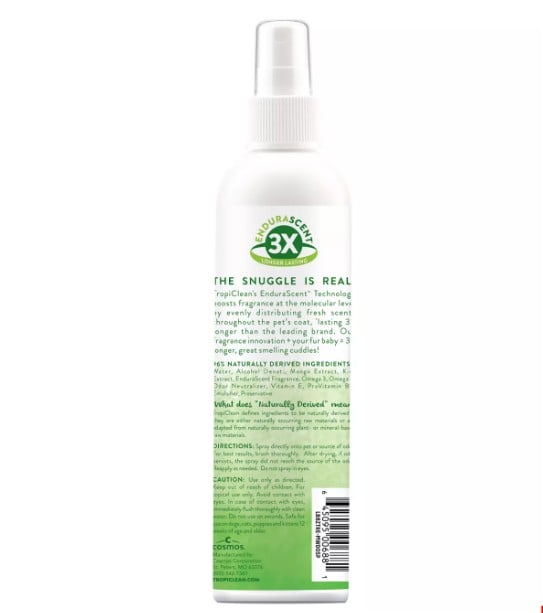TropiClean Mango & Kiwi Deodorizing Pet Spray features the TropiClean EnduraScent Technology. It boosts fragrances, evenly distributing fresh scent throughout the pet’s coat, *lasting 3 times longer than the leading brand. Natural ingredients and is paraben and dye free.
