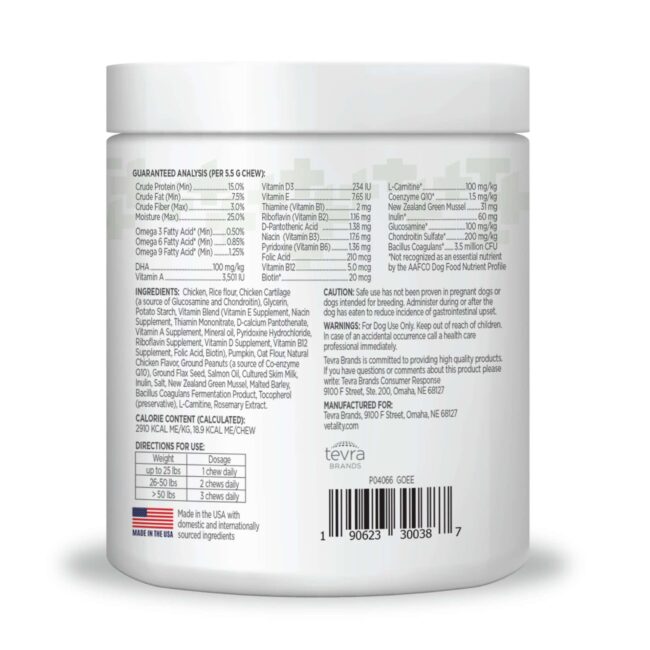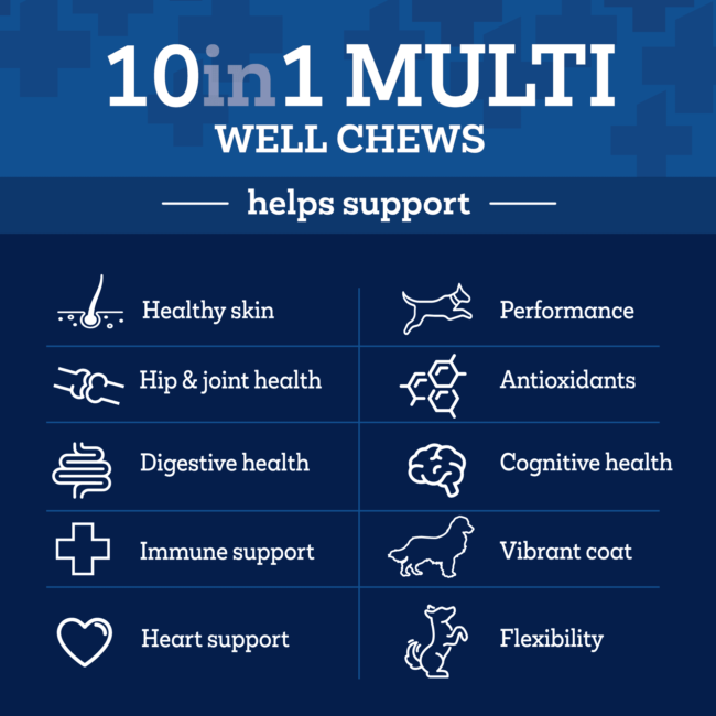 Vetality® 10in1 Multi Well Chews for Dogs is an advanced multi-function blend for the overall health of your dog. This supplement helps support a healthy skin, hip & joint health, digestive health, immune support, heart support, helps with cognitive health, support a vibrant coat, boost performance & mobility, and has antioxidants that help reduce stress. Dogs love these chicken flavored Vetality 10in1 Multi Well Chews. Suitable for dogs of all ages and sizes.