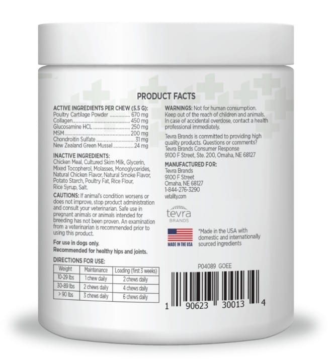 Vetality Hip & Joint Well Chews for Dogs is an advanced mobility blend that provides many benefits to your dog. This blend not only helps maintain healthy hip & joints, but also helps with joint flexibility, inflammatory response, and joint mobility. These chicken flavored chews will have your pup begging for more. This supplement is for dogs of all ages and sizes 10 lbs and up.