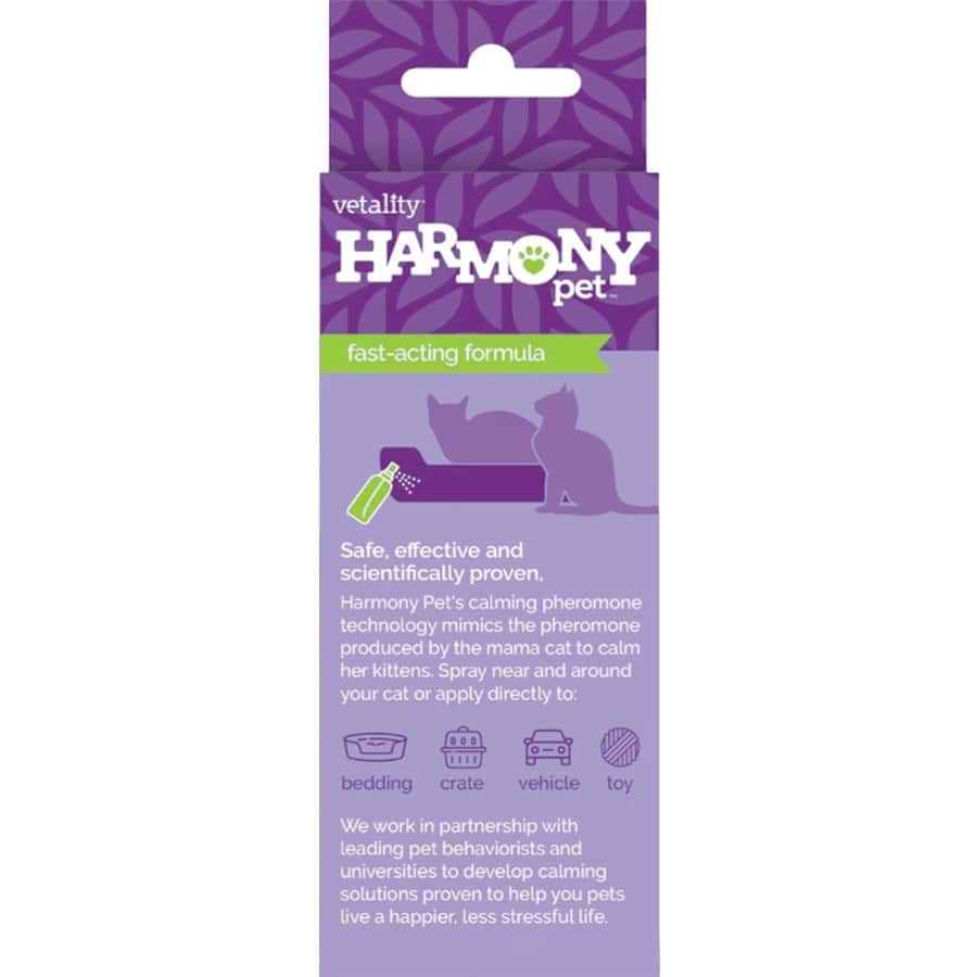 Vetality Harmony Pet Calming Spray for Cats is a scientifically proven solution for calming your feline friend. This versatile spray features P.E.T. calming pheromone, which has been clinically studied and proven to be two and a half times more effective than other leading brands in reducing stress. Simply spray on your kitty’s bedding, crate, toys, or favorite blankie at home or during travel to the vet or groomer. Say goodbye to aggression, jumping, marking, and hissing with Harmony Pet’s calming spray. Please note, this product is not suitable for kittens under six months old. Keep your cat calm and relaxed throughout the day with Harmony Pet Cat Calming Spray.