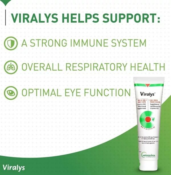Viralys Gel is a powerful L-Lysine supplement that has been proven to ease the clinical signs of infection and reduce viral shedding of herpesvirus type-1 (FHV-1). Which is a common cause of respiratory and eye problems in cats. Specifically developed for cats and kittens to lessen clinical signs and reduce viral shedding. Viralys contains a naturally occurring form of L-Lysine specifically developed for cats and kittens. L-Lysine competes with arginine, an amino acid essential to the development of the herpesvirus, interfering with the virus’s ability to replicate and consequently reducing the viral load. Excellent safety profile with no known side effects Compatible with other therapies L-lysine supplements lessen the clinical signs of infection and reduce viral shedding.