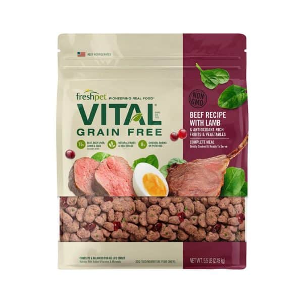 Bring a fresh approach to your furry friend’s nutrition with Freshpet Vital Beef & Lamb Recipe Grain-Free Fresh Dog Food! Even the pickiest pets love fresh meats and veggies. This grain-free recipe features nutrient-rich proteins, fruits and veggies, including 100% natural beef & lamb and antioxidant-rich spinach and cranberries. These wholesome ingredients are gently cooked, unlocking their nutritional benefits to help your canine companion thrive. Our Fresh and Prepared Meals include products that are gently cooked and minimally processed. These meals are sure to excite and fulfill your furry friend’s cravings.