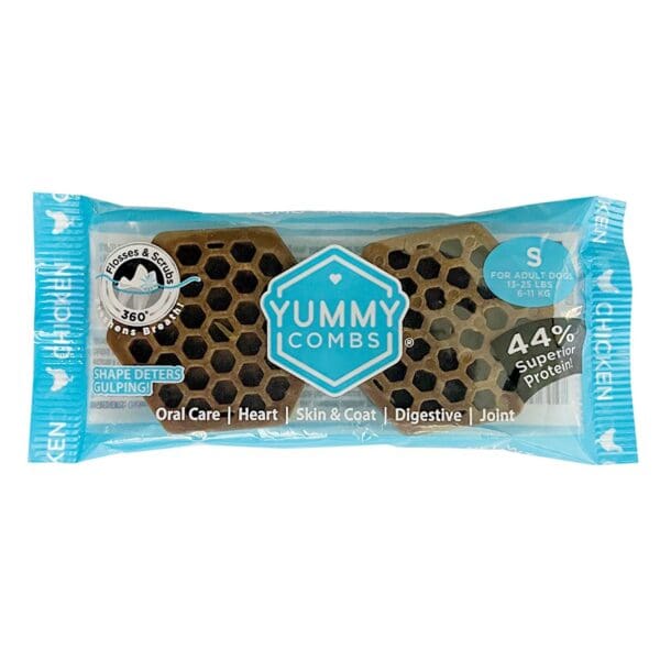 Yummy Combs dental dog treats clean teeth to the gum line with a unique honeycomb design that reduces plaque and supports oral health